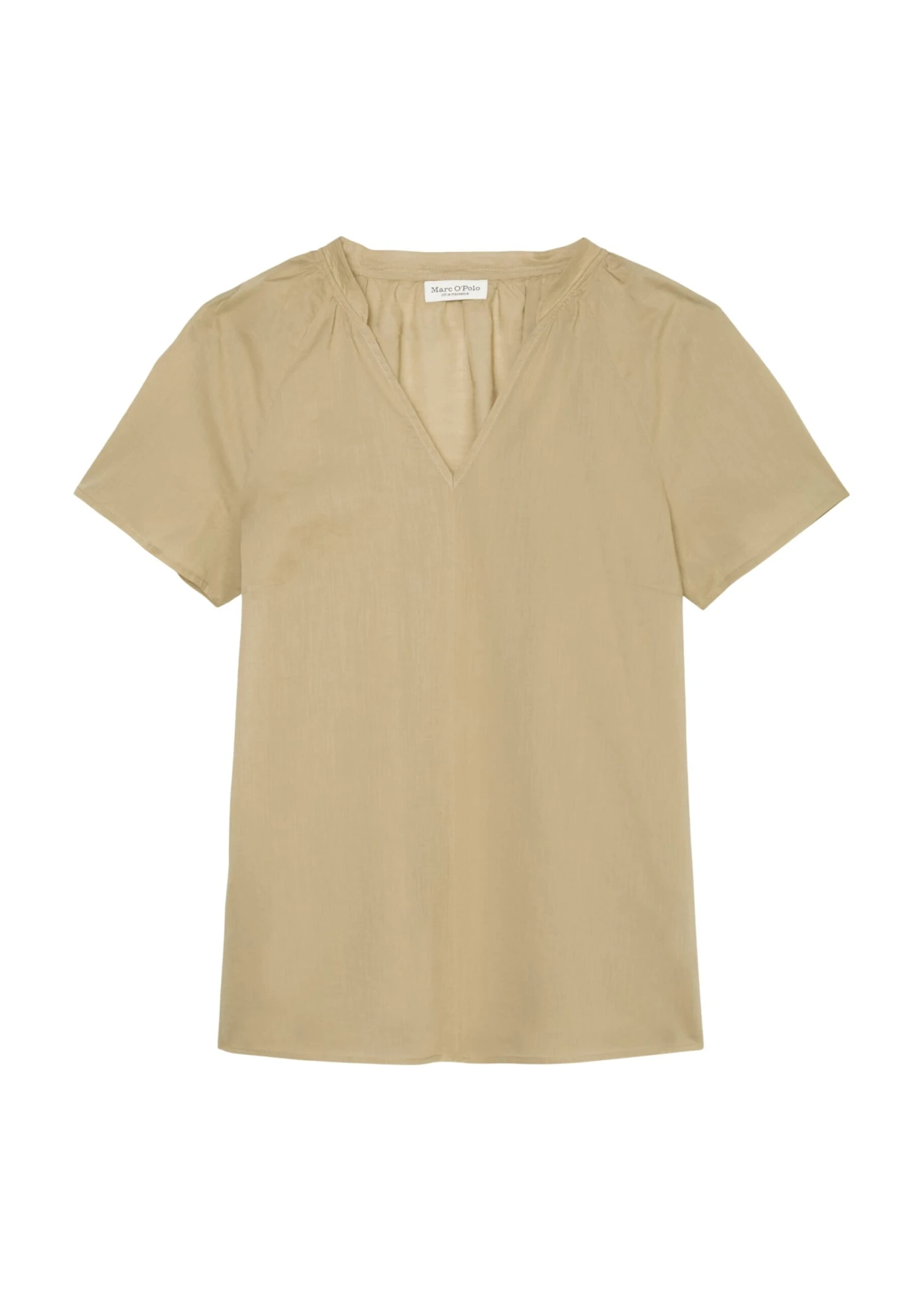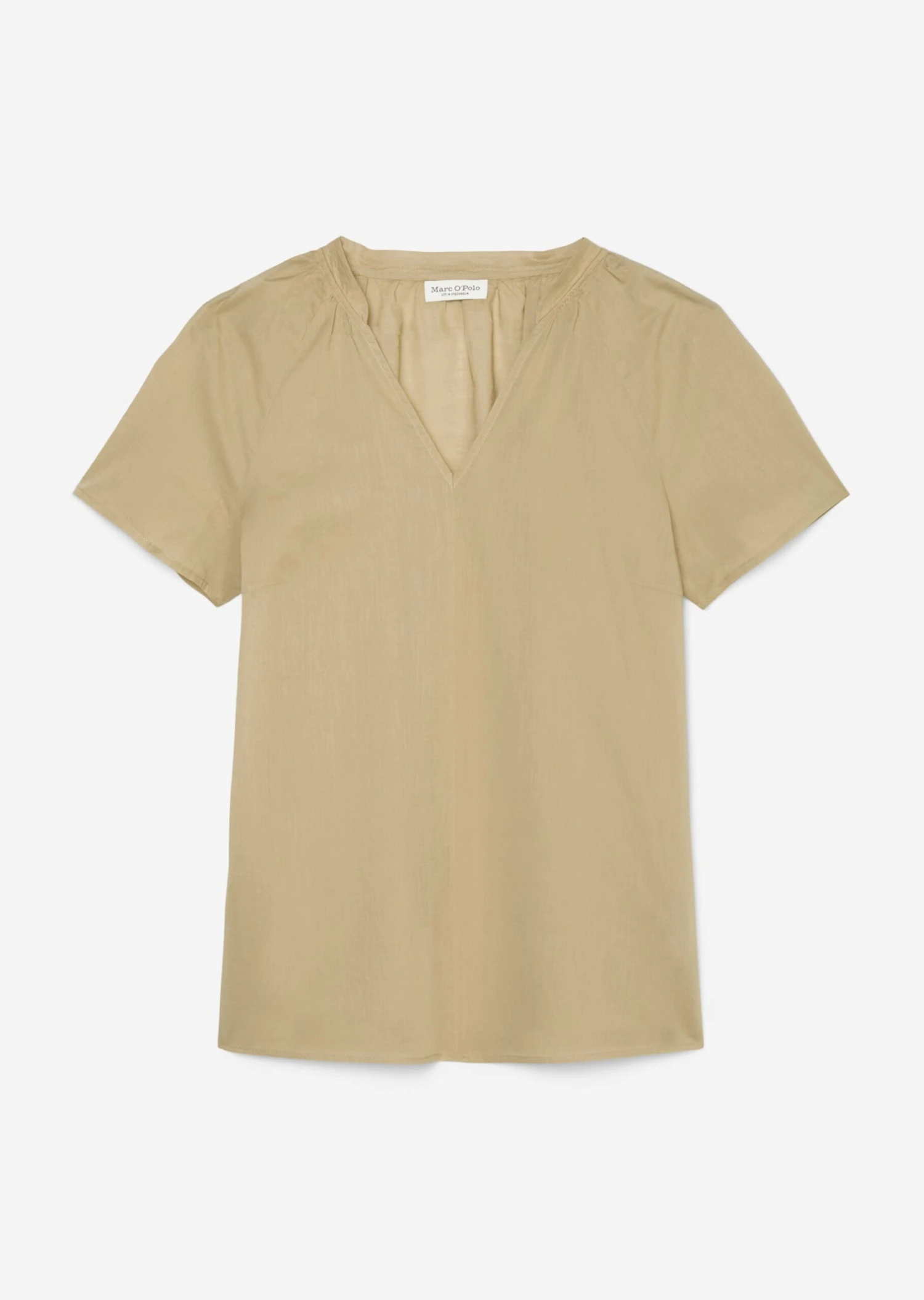 It’s a casual alternative to a classic blouse or a timeless T-shirt – the blouse top. This loose design comes in a regular fit, is made of high-quality organic cotton voile and has short raglan sleeves and a distinctive neckline. The deep V-neck is finished with an additional band collar detail and feminine gathering. The versatile piece is a reliable companion that can be effortlessly teamed with a host of bottoms that are already in your wardrobe.