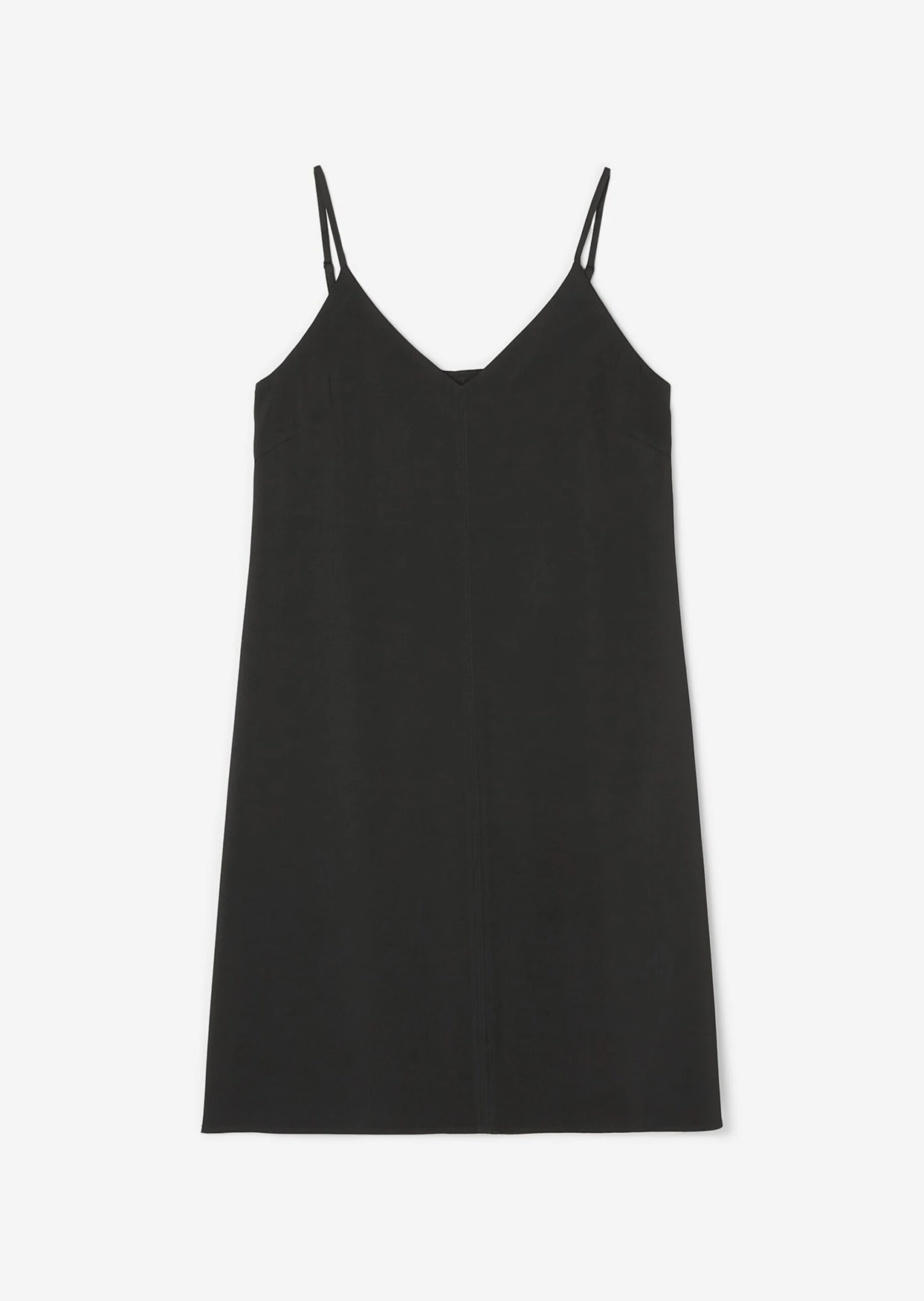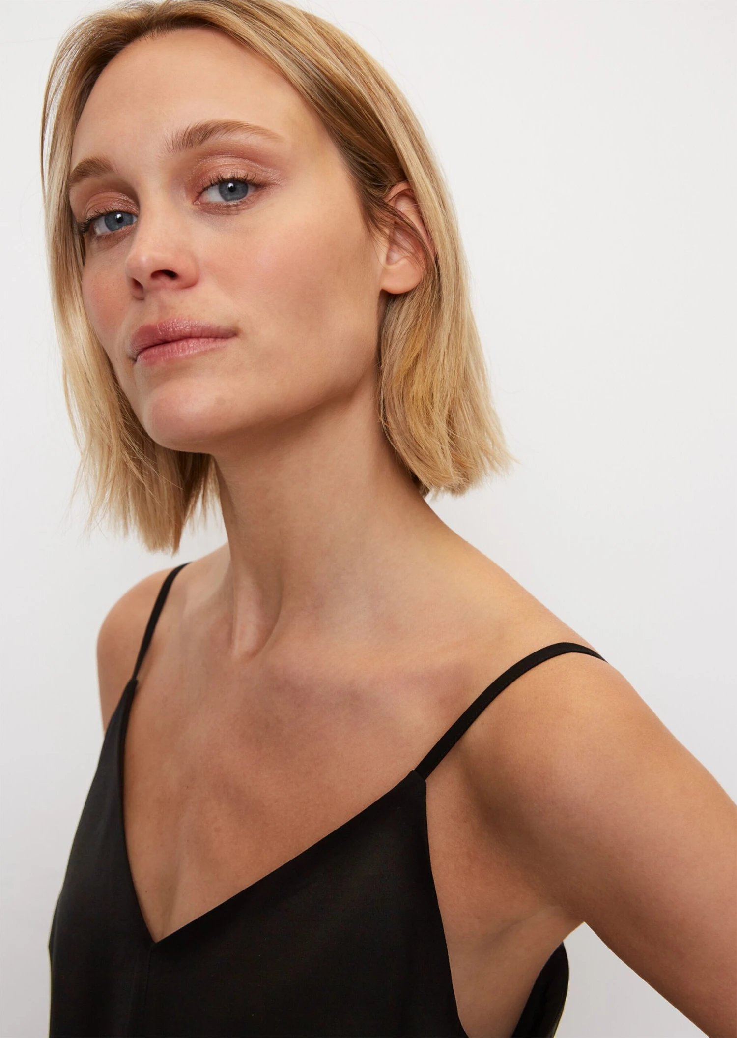Simple and incredibly versatile for mixing and matching, this short, delicate and flowing slip dress is made of high-quality, soft viscose twill. The dress comes in a lingerie look with a feminine V-neckline, narrow and adjustable spaghetti straps and a straight back neckline. It is unlined and gently skims the figure with its casual A-line design.