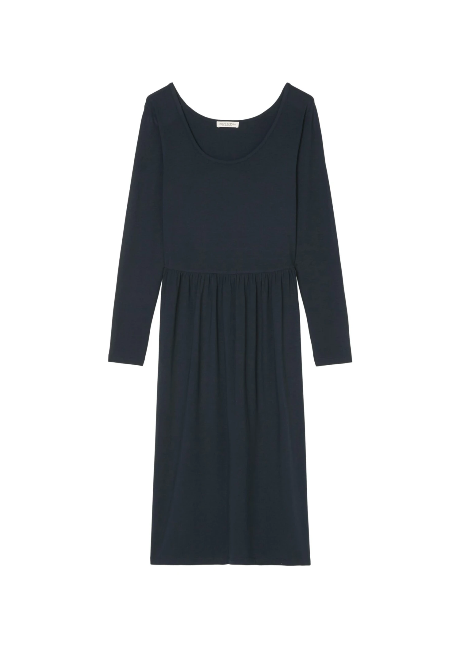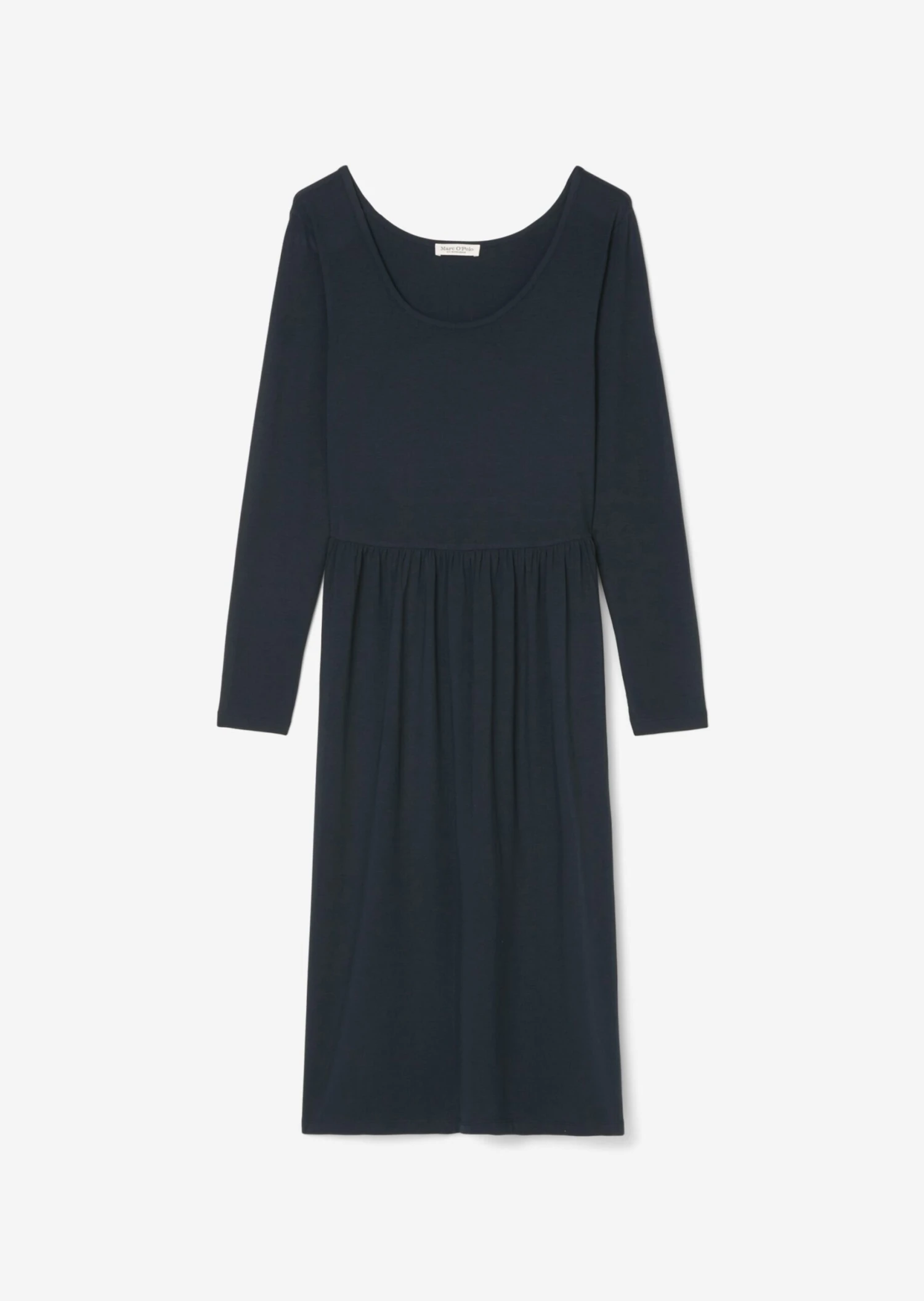 This casual and elegant jersey dress combines two trends in one. The first trend – dresses with a wide skirt! And the second – dresses made of soft, high-quality materials. It looks super chic paired with a blazer and cool trainers. This dress has a close-fitting upper section with a wide round neckline and long, slim sleeves, plus a loose, flared skirt with a gathered joining seam at the waist It is made of super soft, flowing jersey in a stretchy blend of modal and organic cotton.