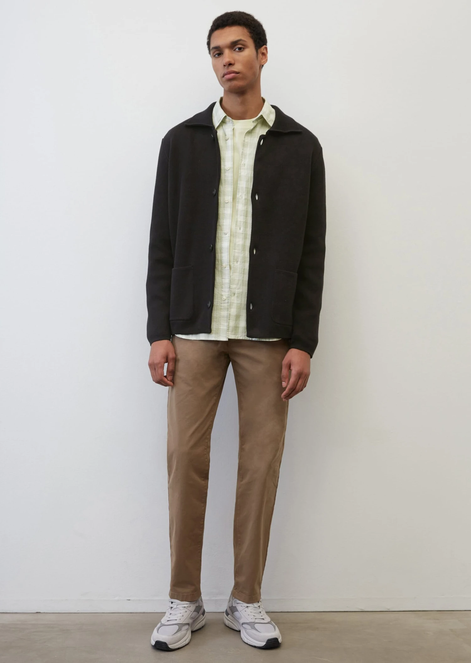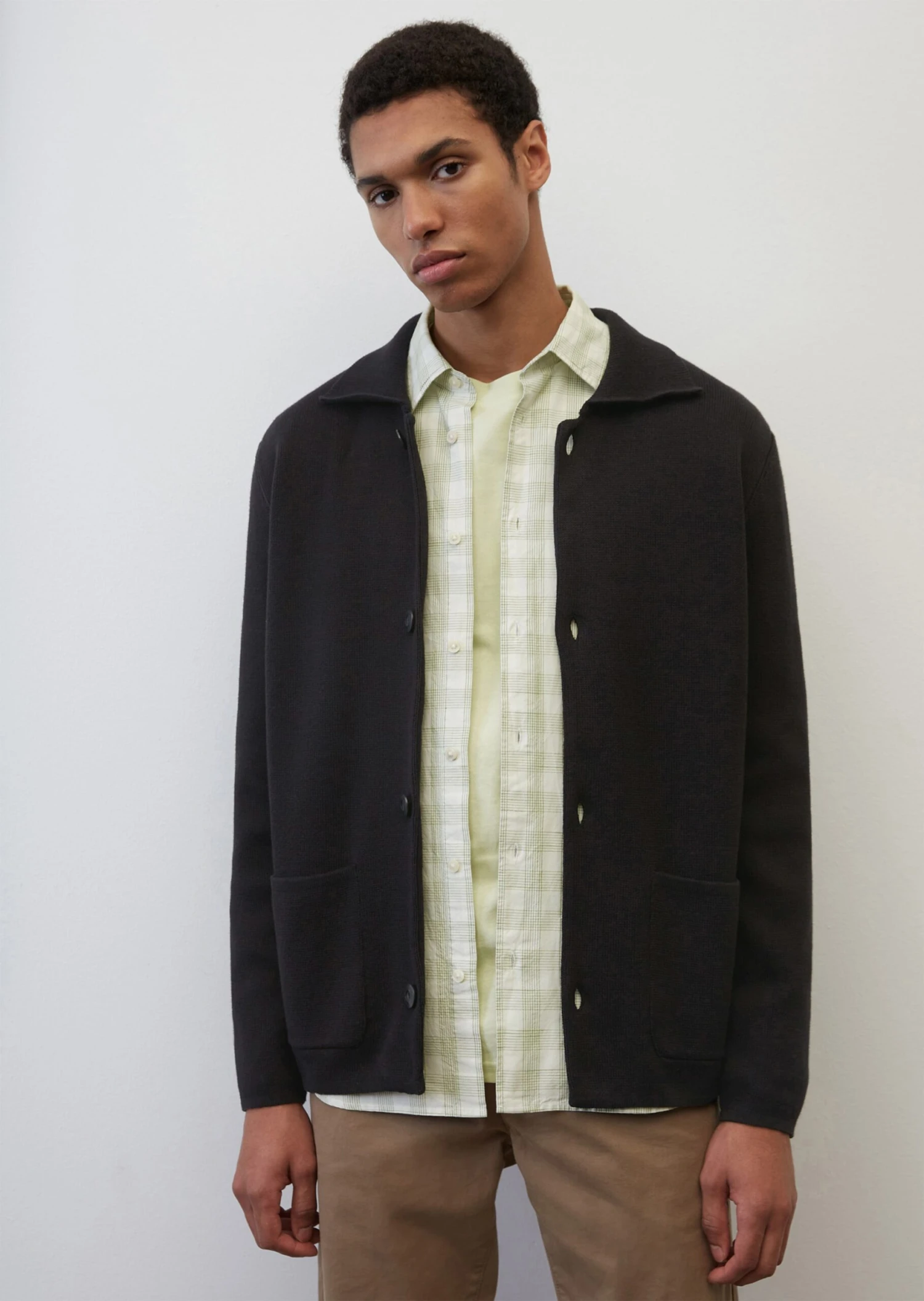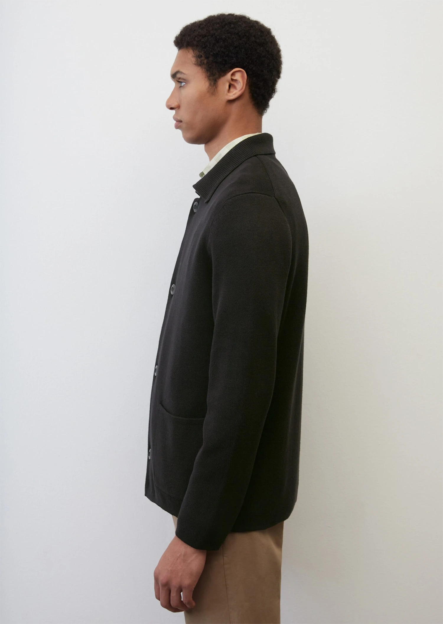 Smart and casual at the same time: this high-quality cardigan with a Milano texture can be styled with a variety of outfits. It is made of GOTS-certified organic cotton and comes in a masculine regular fit. The cardigan also features a flat knit collar, dropped shoulders, a full-length button placket with logo buttons in a contrasting collar and side patch pockets.