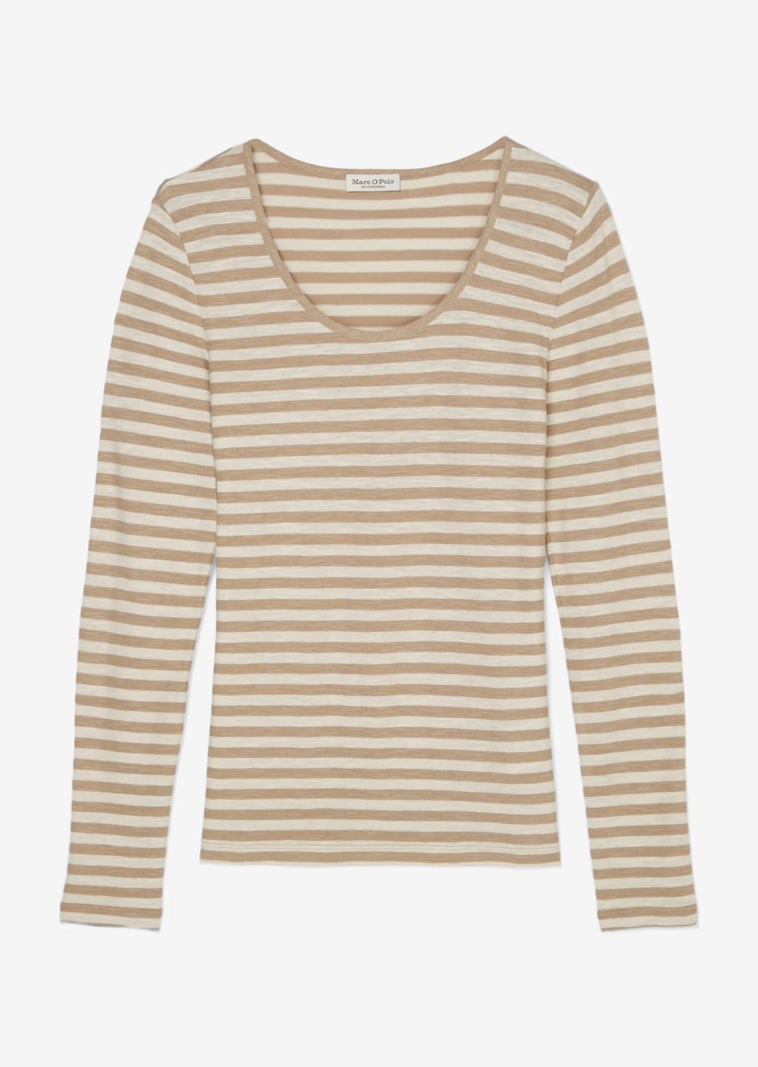 Whether paired with a smart blazer or a sporty cardigan or leather jacket– either way, this striped long sleeve top is perfect for pairing with a wide variety of casual looks. For the office, everyday wear or travelling. Made of pure, GOTS-certified organic slub jersey cotton with a wide, round neckline and a straight hemline. High-quality and casual: the yarn-dyed striped pattern.