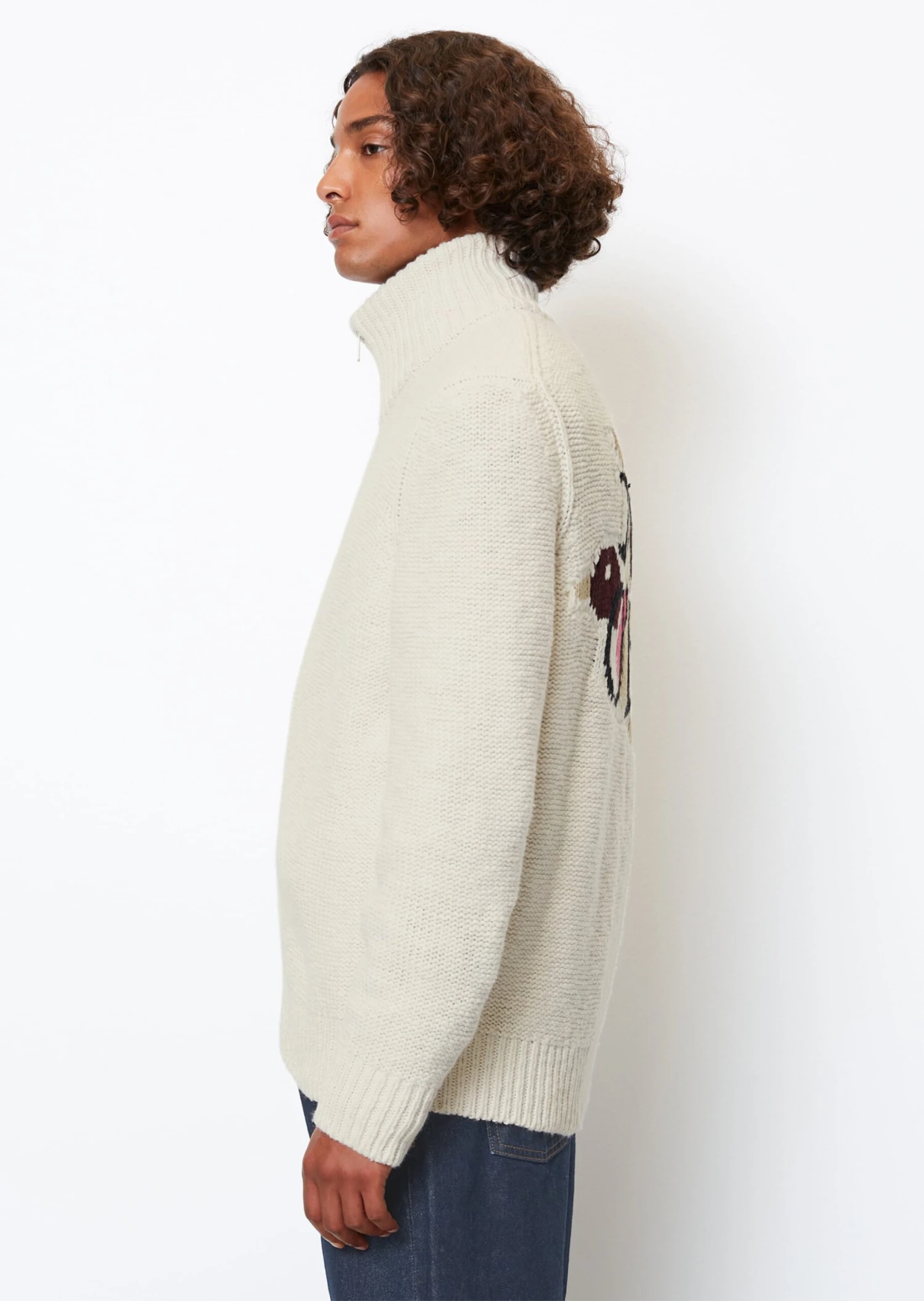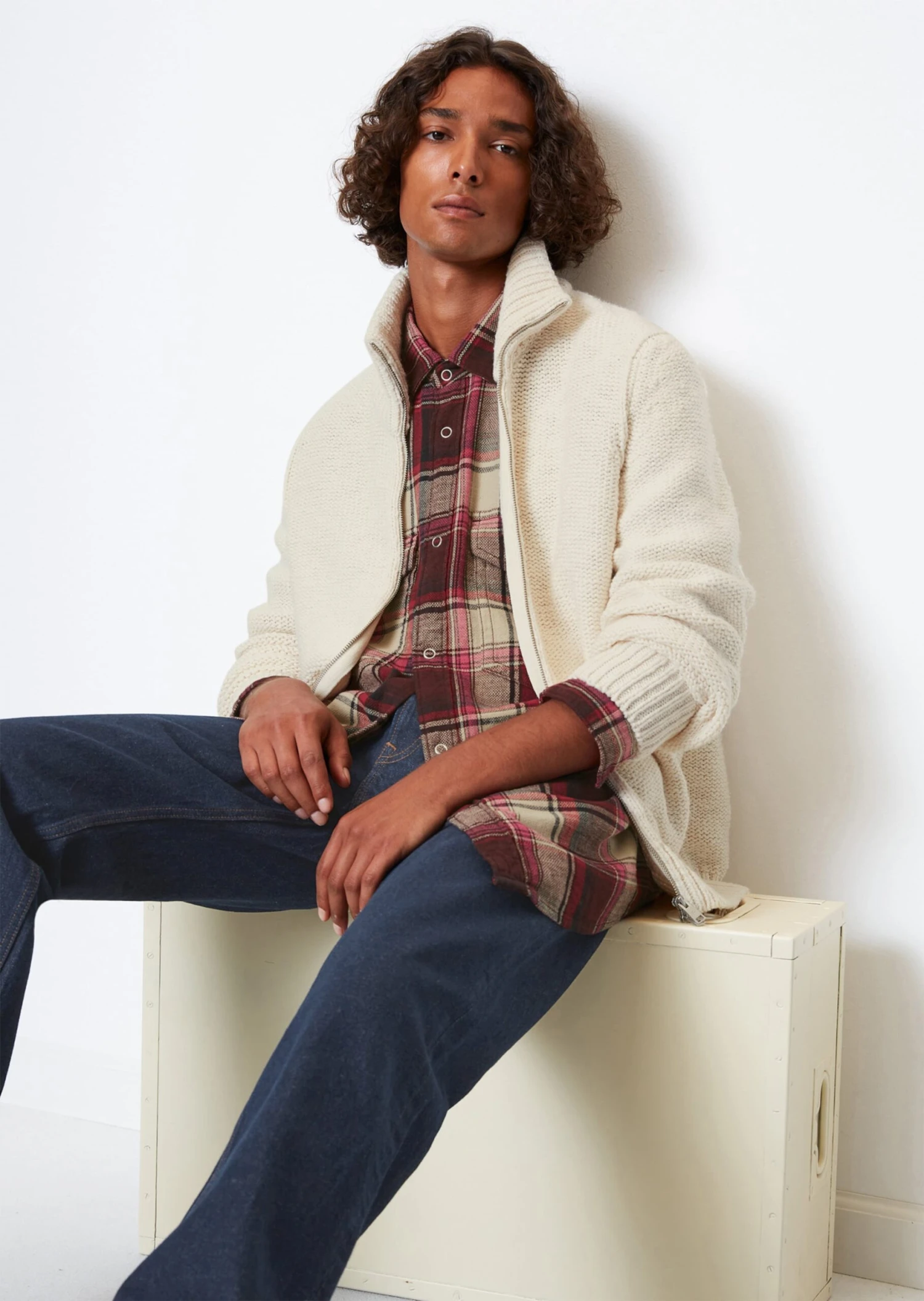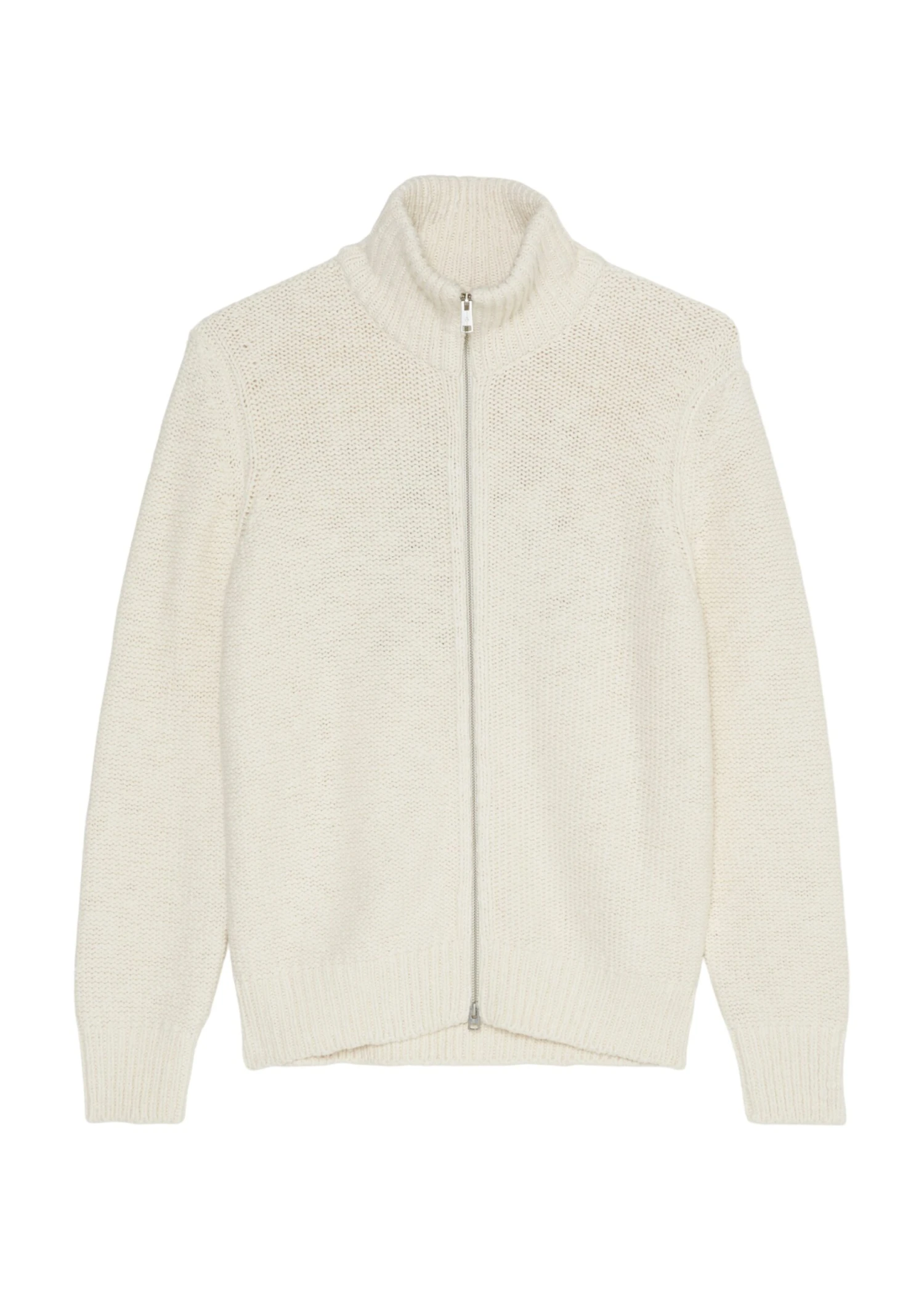 Marc O’Polo x CHEVIGNON. Iconic, limited, authentic: Nordic naturalness meets French free spirit! The high-quality cardigan made of a soft mix of organic cotton with virgin wool content convinces with its very individual design. In a masculine regular fit, it comes with a wide ribbed stand-up collar and cuffs at the sleeves and hem. The left knit pattern is contrasted by a practical two-way zipper made of metal. Absolute highlight: the back view with multicolored logo inlays.