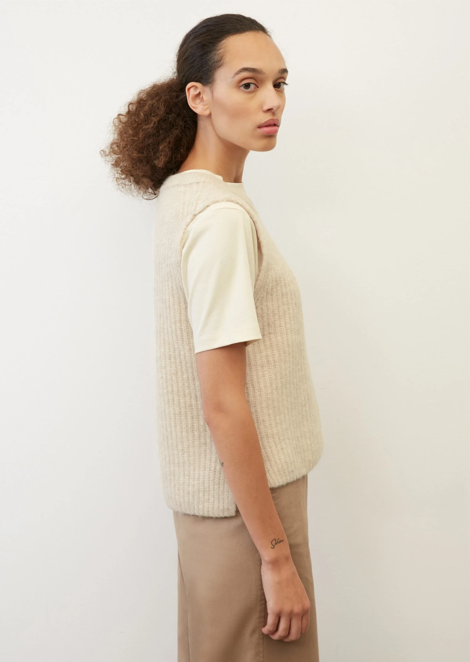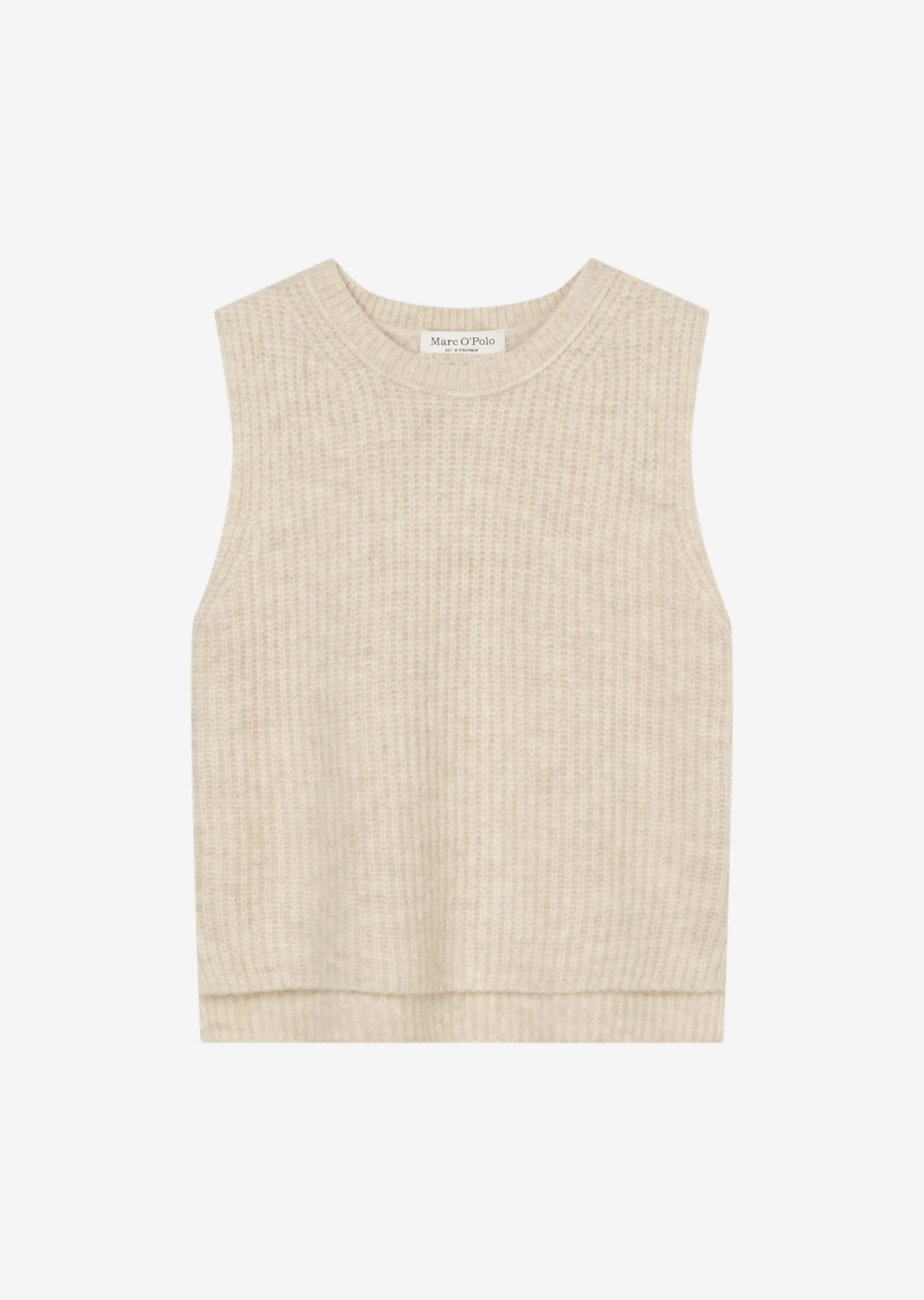 Has established itself and become a go-to wardrobe staple – last season’s It piece: the sleeveless jumper! This contemporary fashion statement is crafted from a soft, cosy blend of new wool and alpaca wool with elastane and comes in a regular fit in a slightly cropped length. With a ribbed round neckline, deep armholes and straight tiered hem. The sleeveless jumper is perfect for casual layered looks and also works as a solo piece on bare skin.