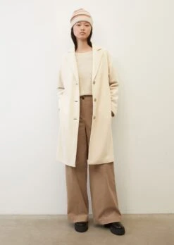 The Italian wool coat – elegant, sustainable and made from an exclusive recycled super soft blend of premium jersey and wool. This high-quality coat with a lapel collar comes in a classic style with a deep V-neckline, dropped shoulders and modern straight mid-length raglan sleeves with a regular cuff. This unlined piece buttons up at the front and has two inconspicuous in-seam slash pockets. Elaborately finished on the inside with bound seams and a half-lining. Modern yet timeless, this is the quintessential understatement piece.