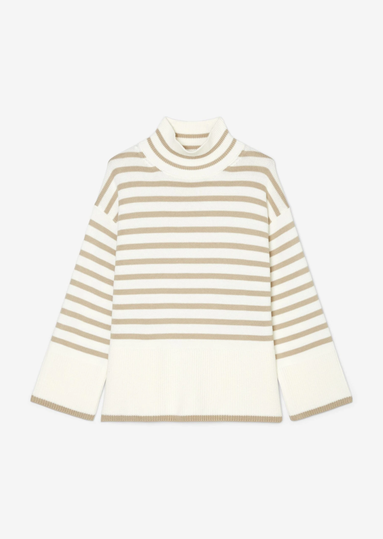 The casual knitted jumper in Breton style is the piece that was constantly sold out last season. The nautical stripe pattern is covetable, it’s modern yet classic and timeless. Cool oversize fit in pure, heavy organic cotton yarn with a high stand-up collar that folds over, overcut shoulders and extra-wide ribbed cuffs and hem. Casual: the high side seam slits.