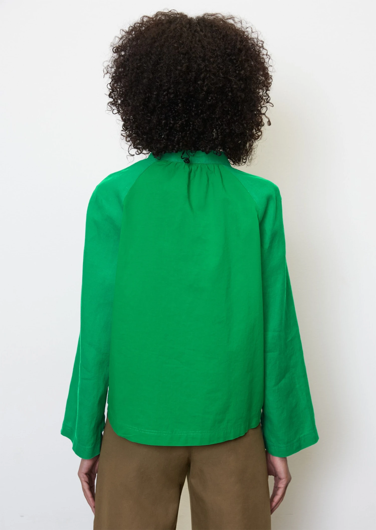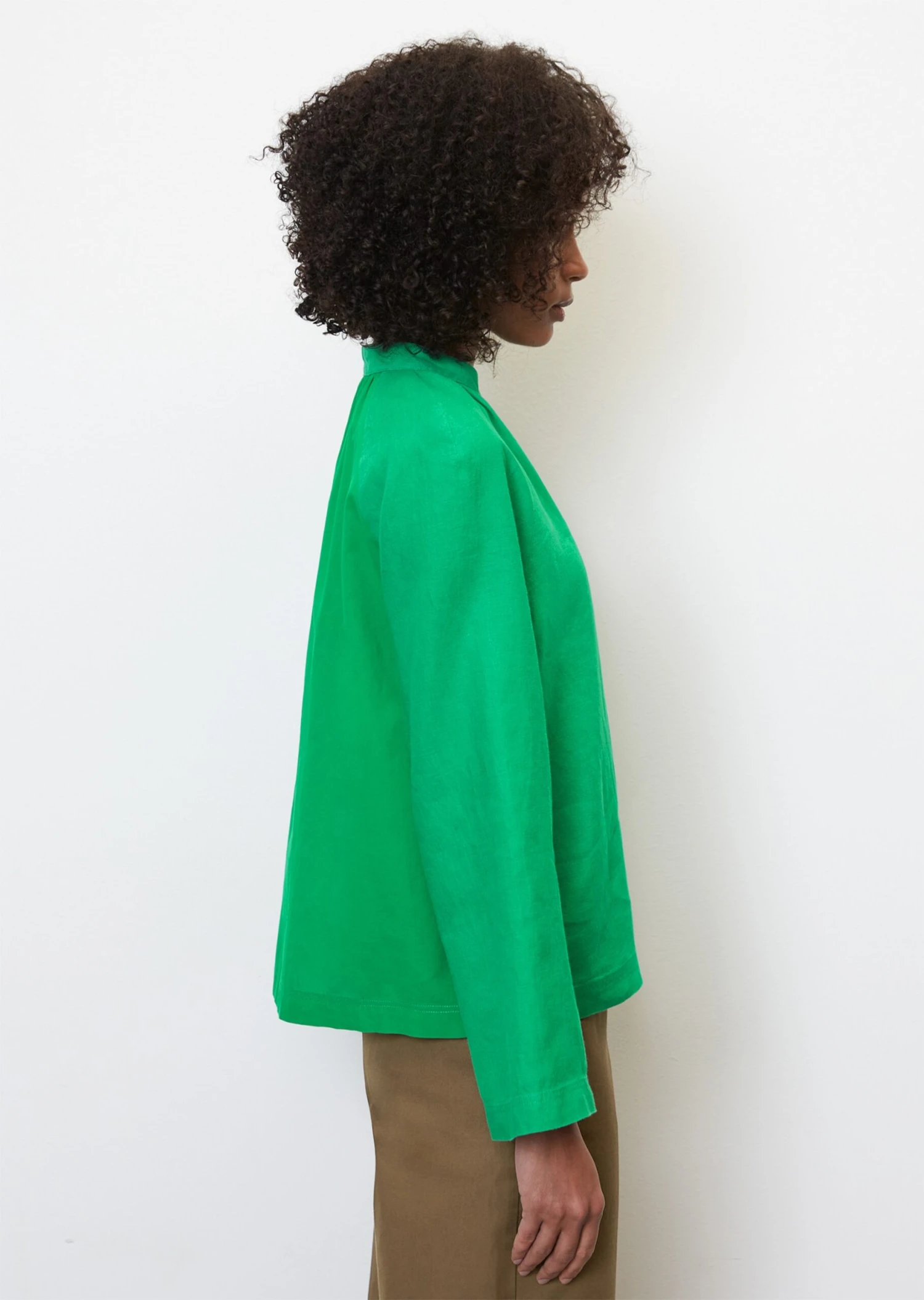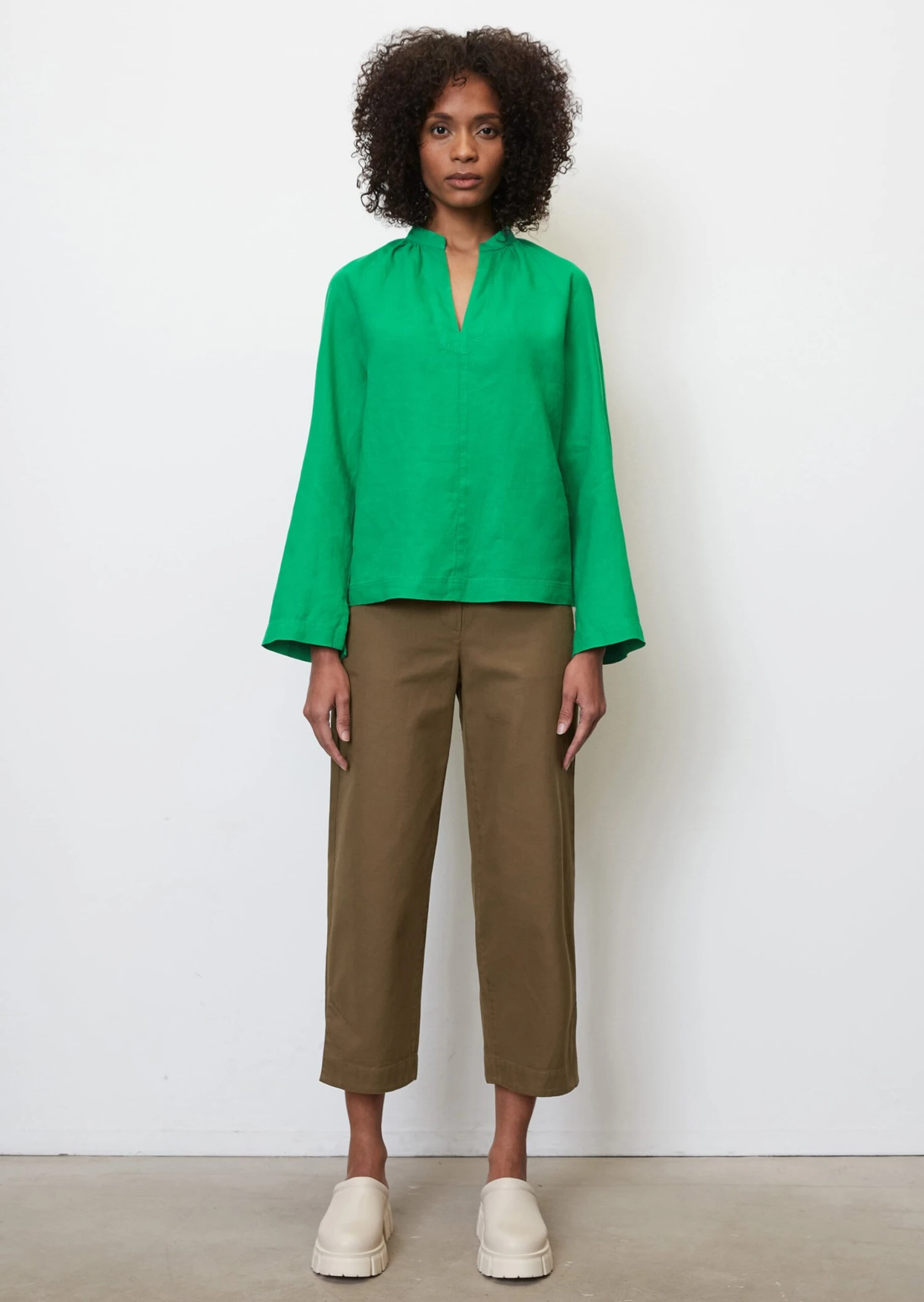 The embodiment of clean boho style, this loose tunic blouse comes in an elegant mix of materials. The timeless piece has a gathered round neckline with a stand-up collar, a deep V-neck and straight raglan sleeves with a casual slit hem. The front is embellished with a central dividing seam while the back is kept simple. Special feature: The front section and sleeves are made of pure linen and the back is made of lightweight cotton voile fabric. The design is a great all-rounder for everyday wear and all kinds of occasions.