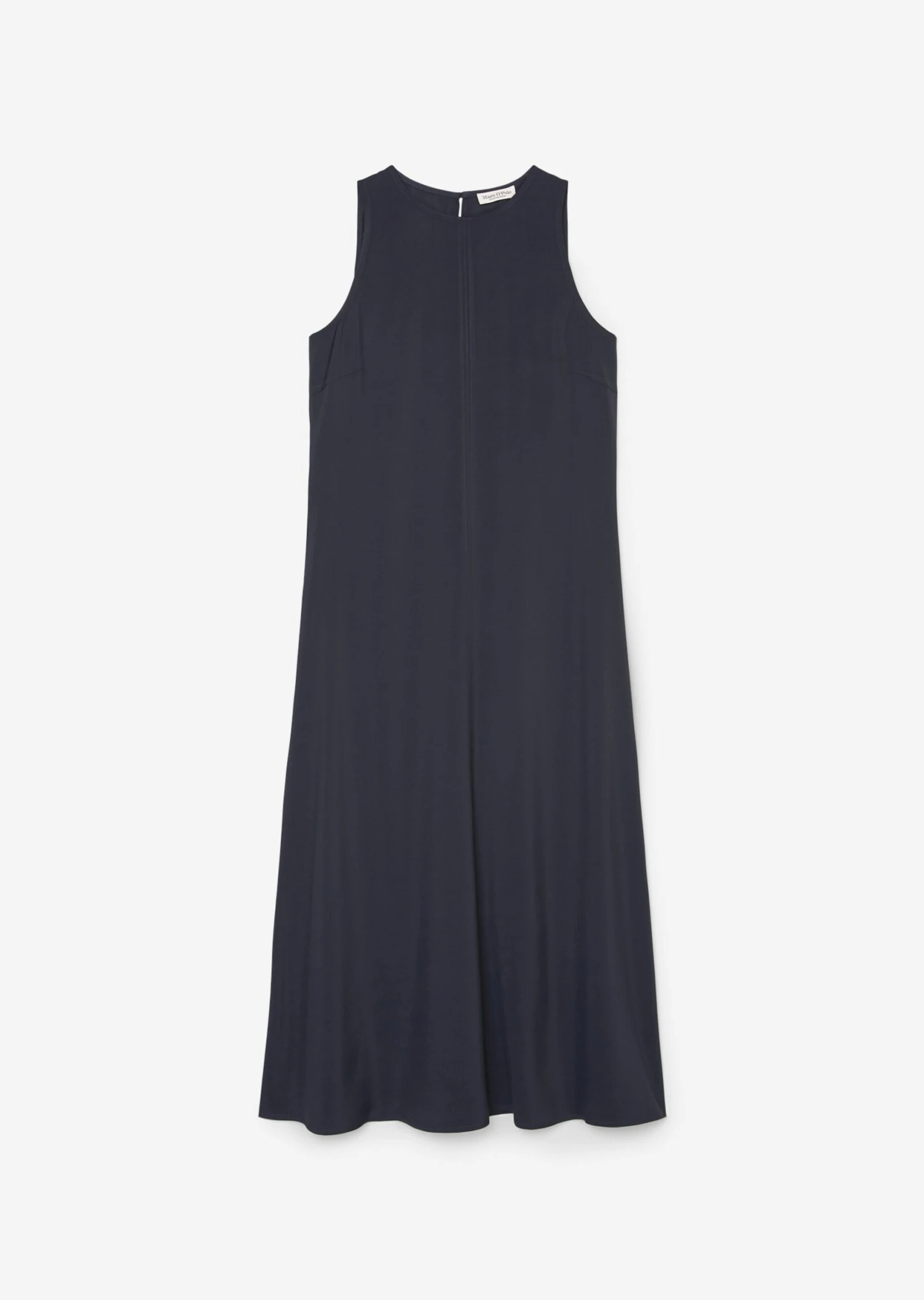 This sleeveless, A-line dress made of extra-soft twill fabric composed of elegant, sustainable viscose creates a long, flowing and feminine silhouette. The design has a low round neckline with a back slit that fastens with a button and loop. The front and back are finished with central dividing seams and the hemline is straight. This piece is unlined. Pair this piece with statement shoes and geometric jewellery for an eye-catching look.