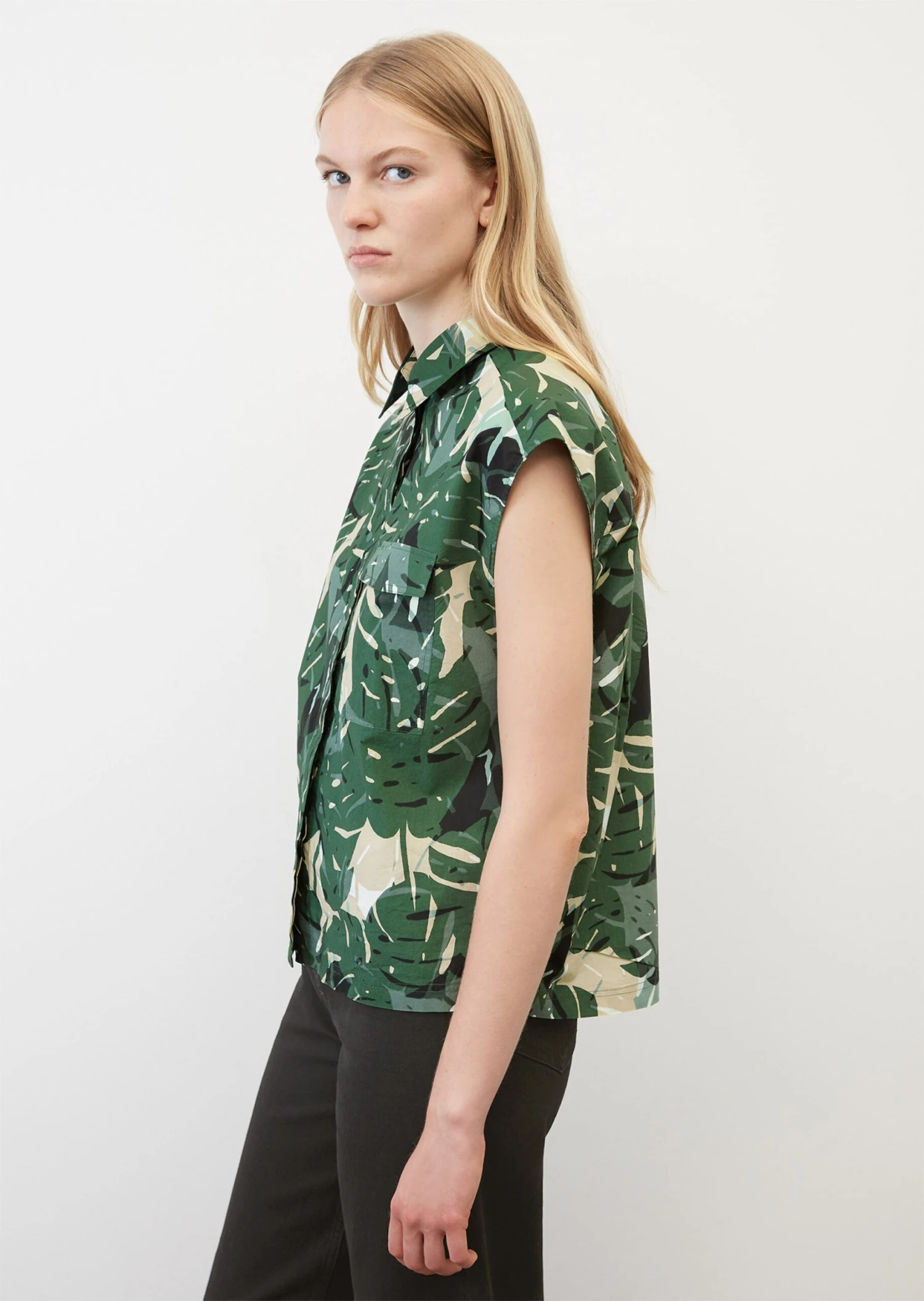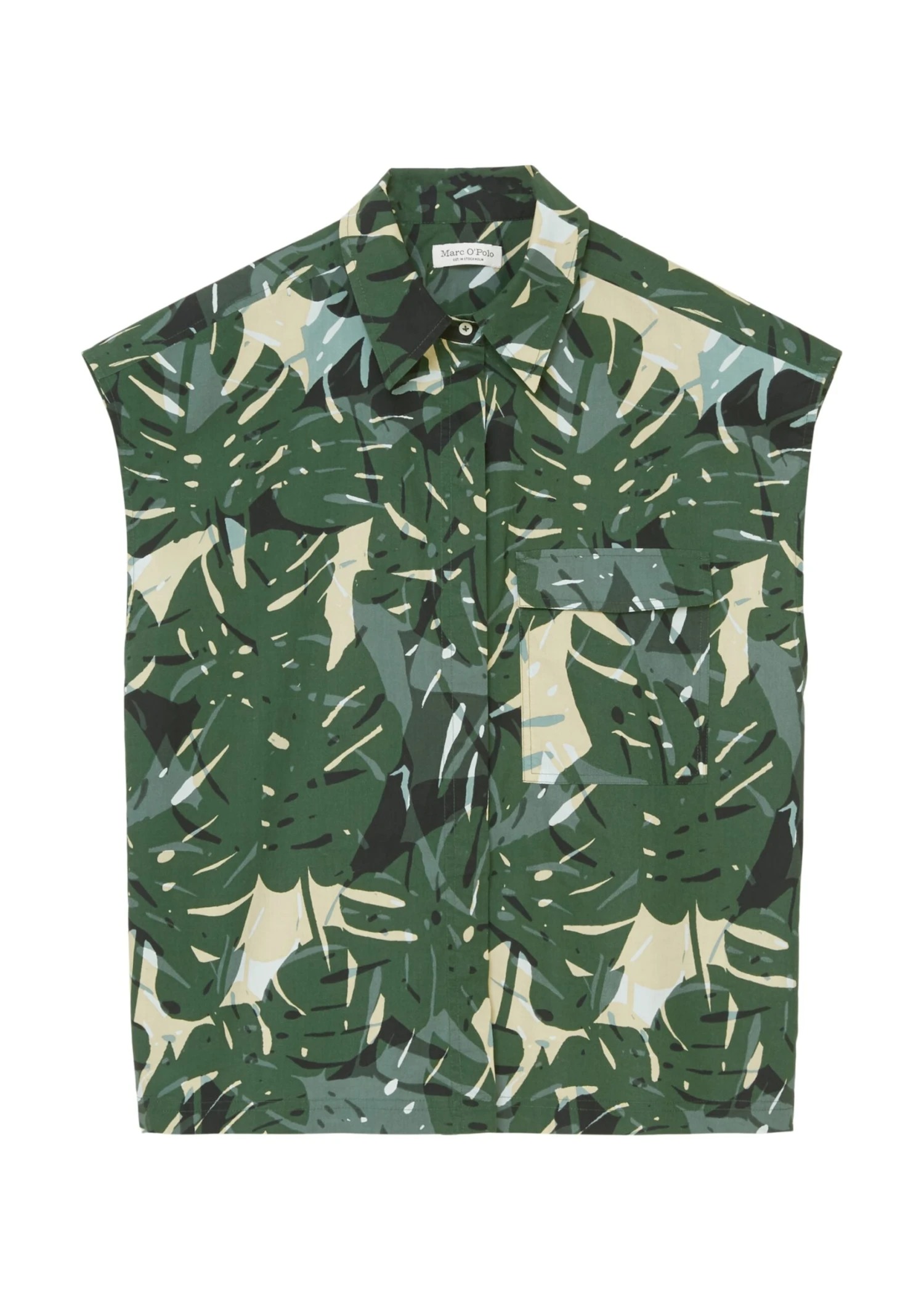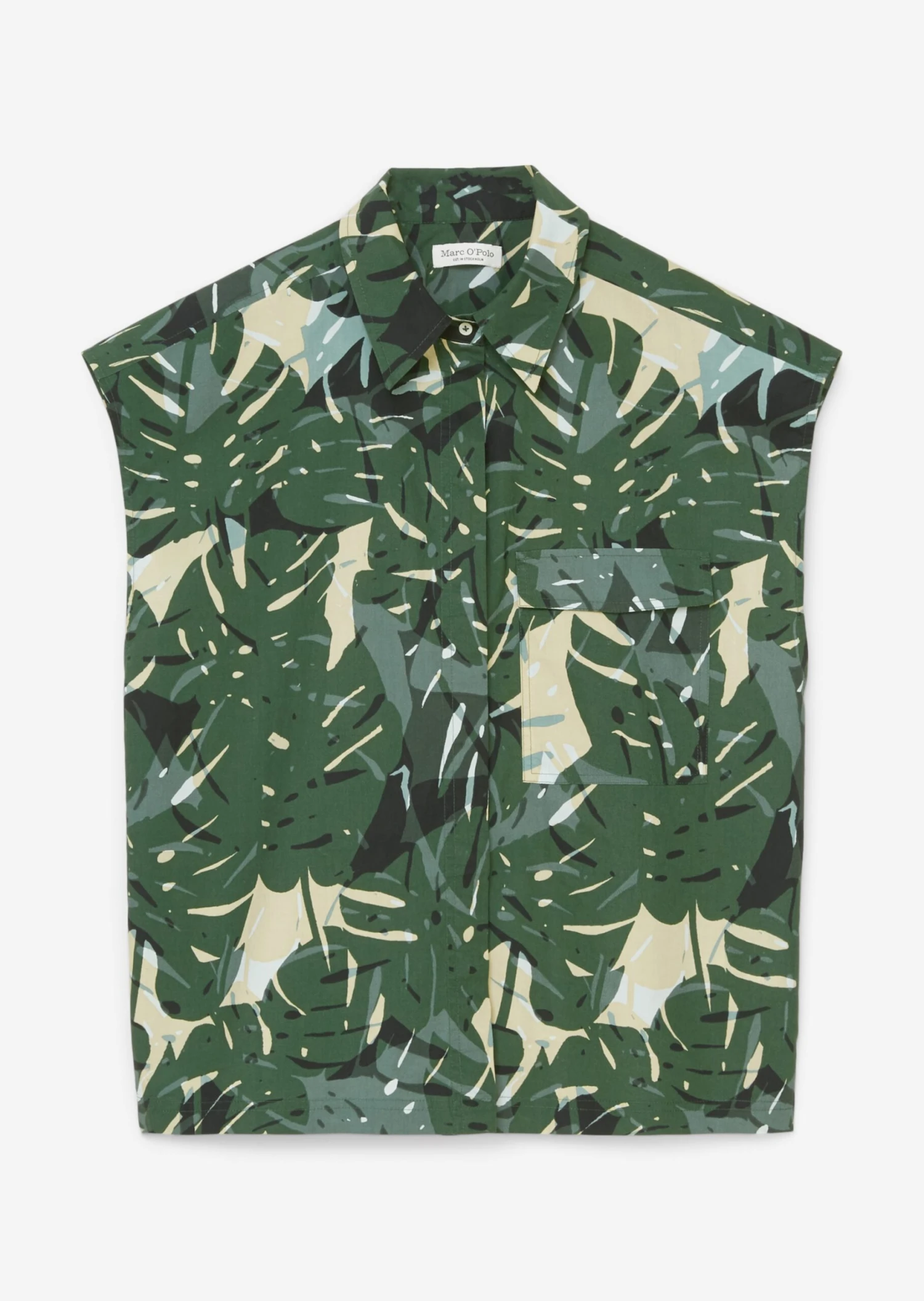 A blouse trend fresh off the catwalk and an essential component of the summer wardrobe: the sleeveless blouse top with an extravagant all-over print. The fit: loose relaxed fit with a classic Kent collar, a concealed button placket, pleat details on the back and a patch breast pocket. Made of airy and comfortable pure organic cotton
