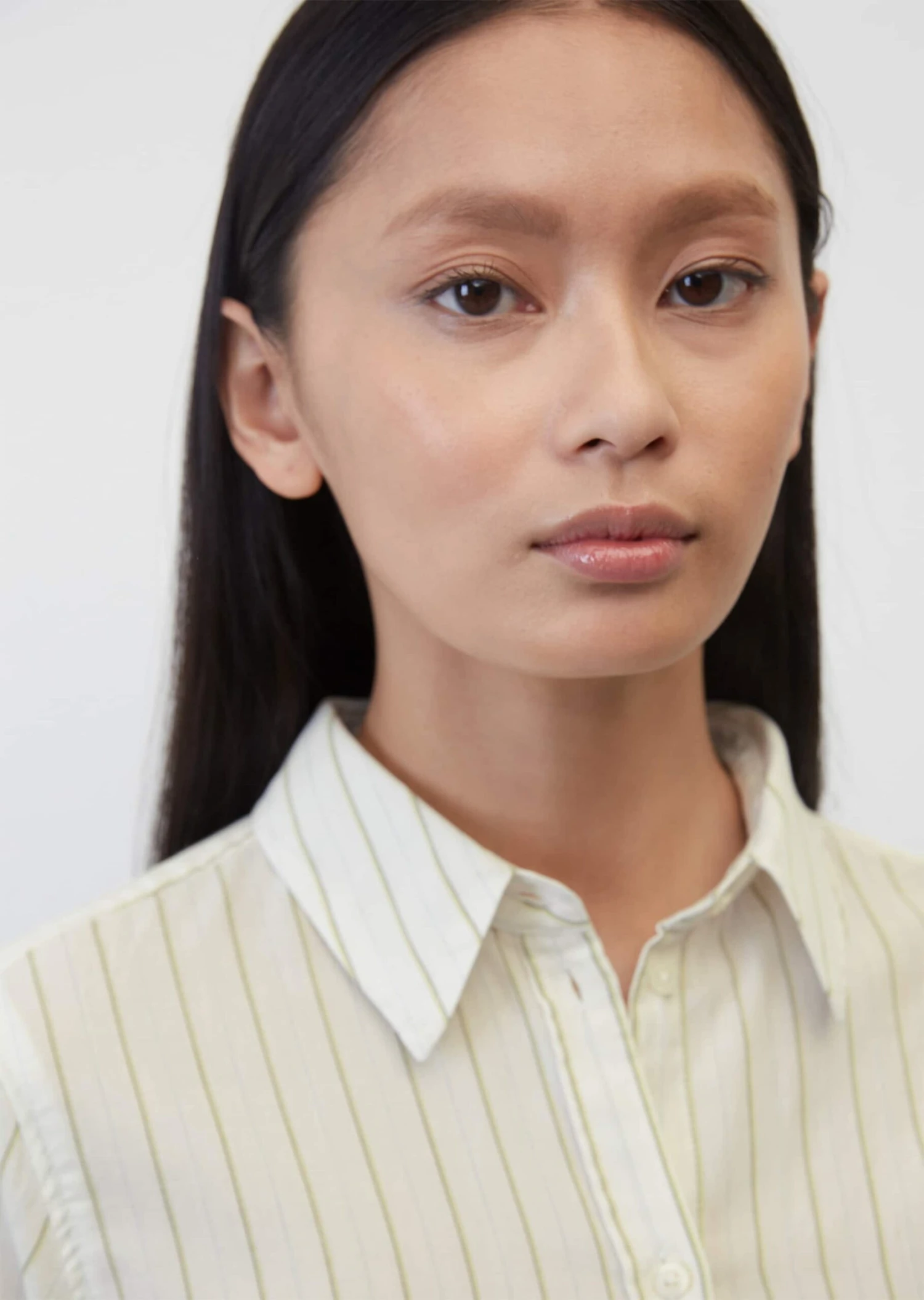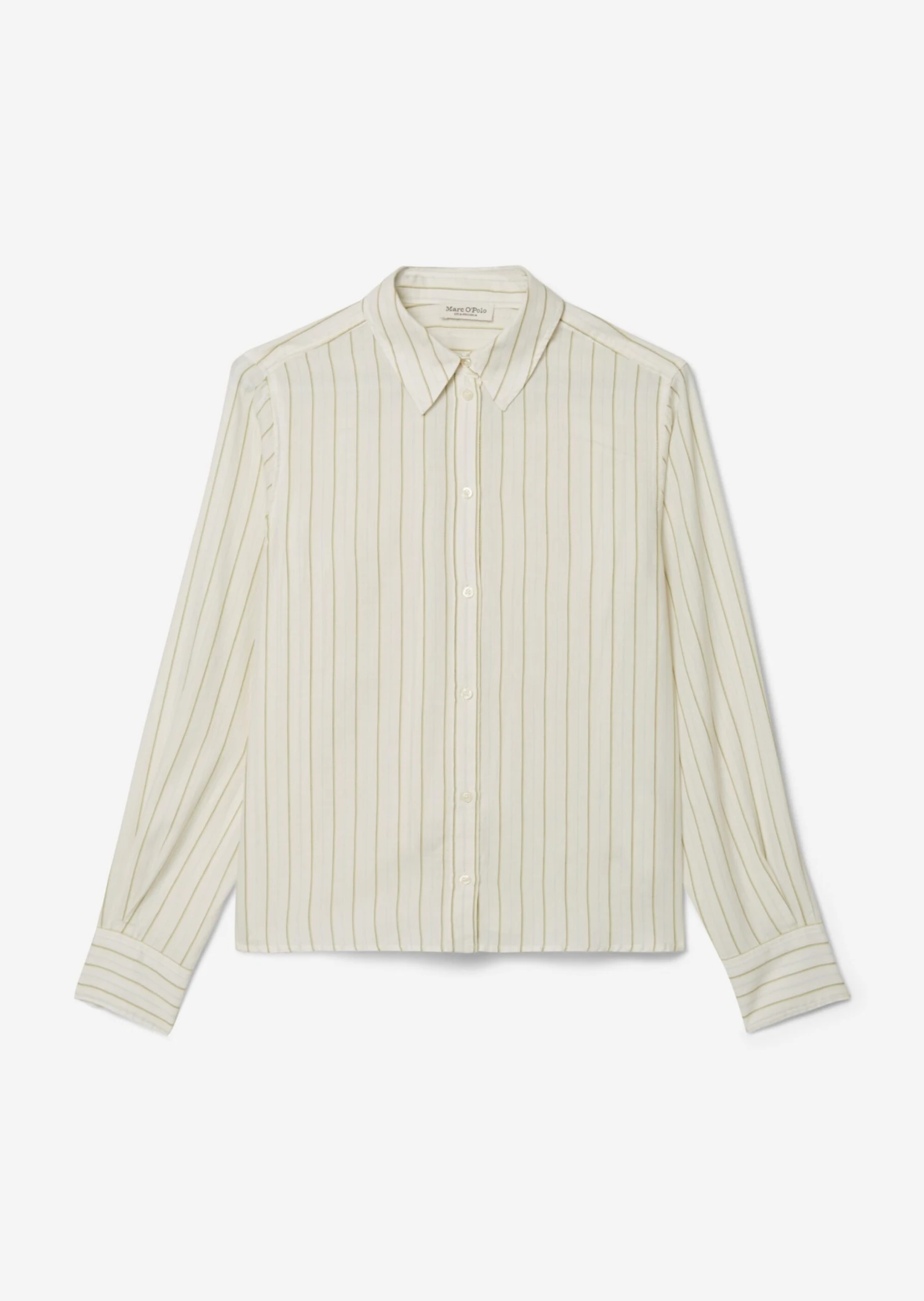 The classic, basic striped blouse has been given an update. This modern alternative features a new, casual O-shaped sleeve design. This slim-fitting blouse is made of pure, yarn-dyed organic cotton twill fabric and has a timeless Kent collar, shoulder yoke, full-length button placket and a beautifully curved hemline. The pleats in the crook of the arm give the sleeves their shape. The stripe pattern gives the blouse a fascinating look, making it an eye-catching addition to your outfit.