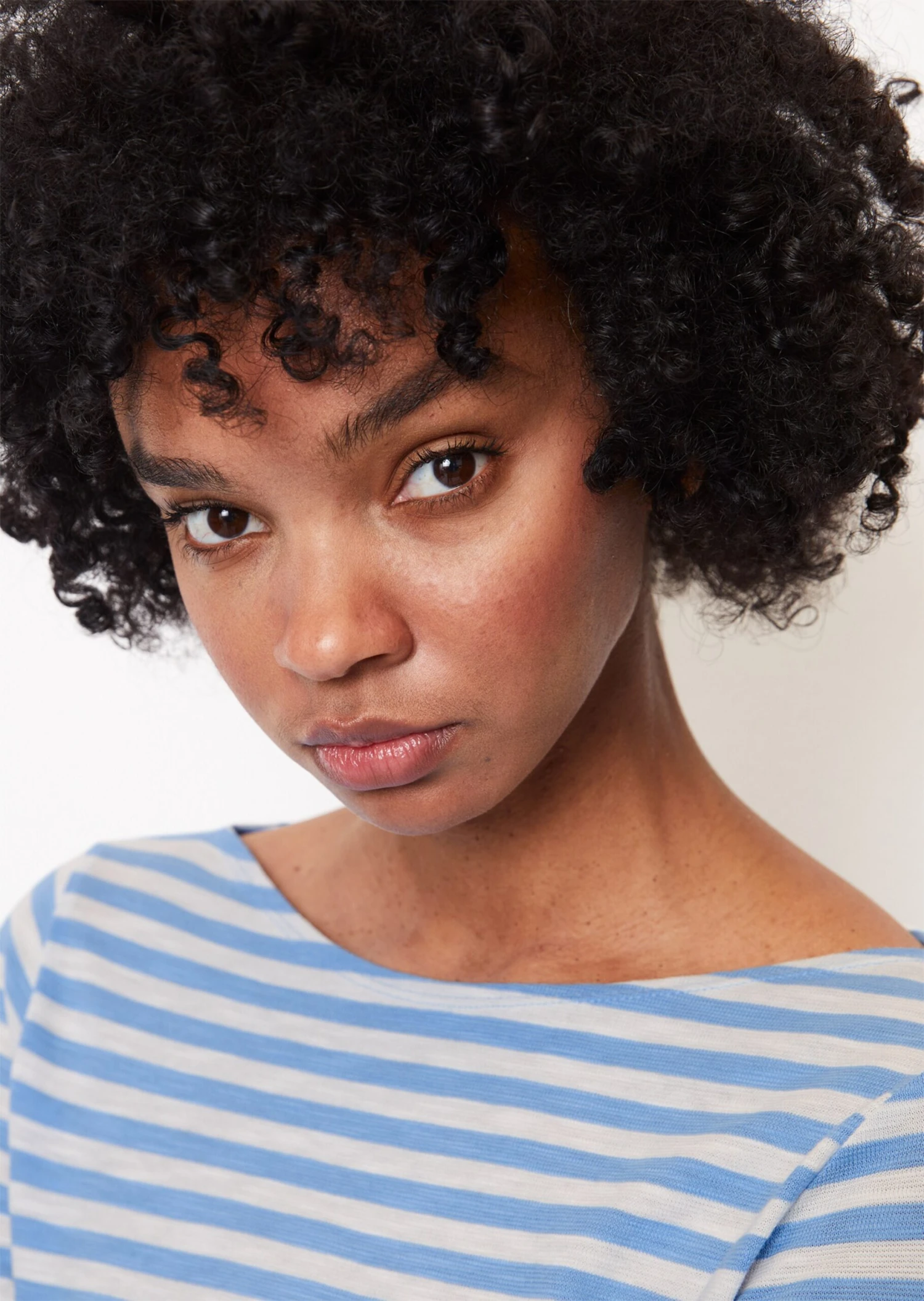 In the style of a French trend piece: super casual striped long sleeve top made of soft, pure organic cotton jersey fabric. Featuring a bateau neckline and a small logo print on the hem. The texture: soft, loose and grainy all at the same time. This high-quality garment made of organically cultivated cotton is an expression of our commitment to the environment.