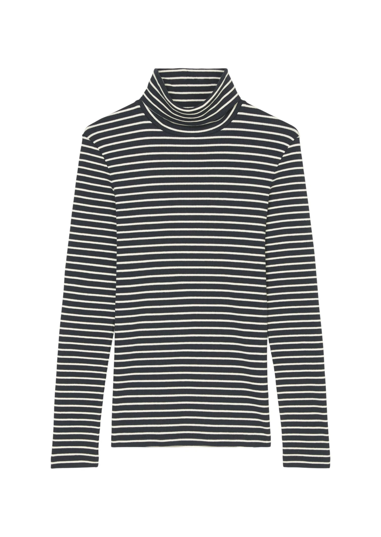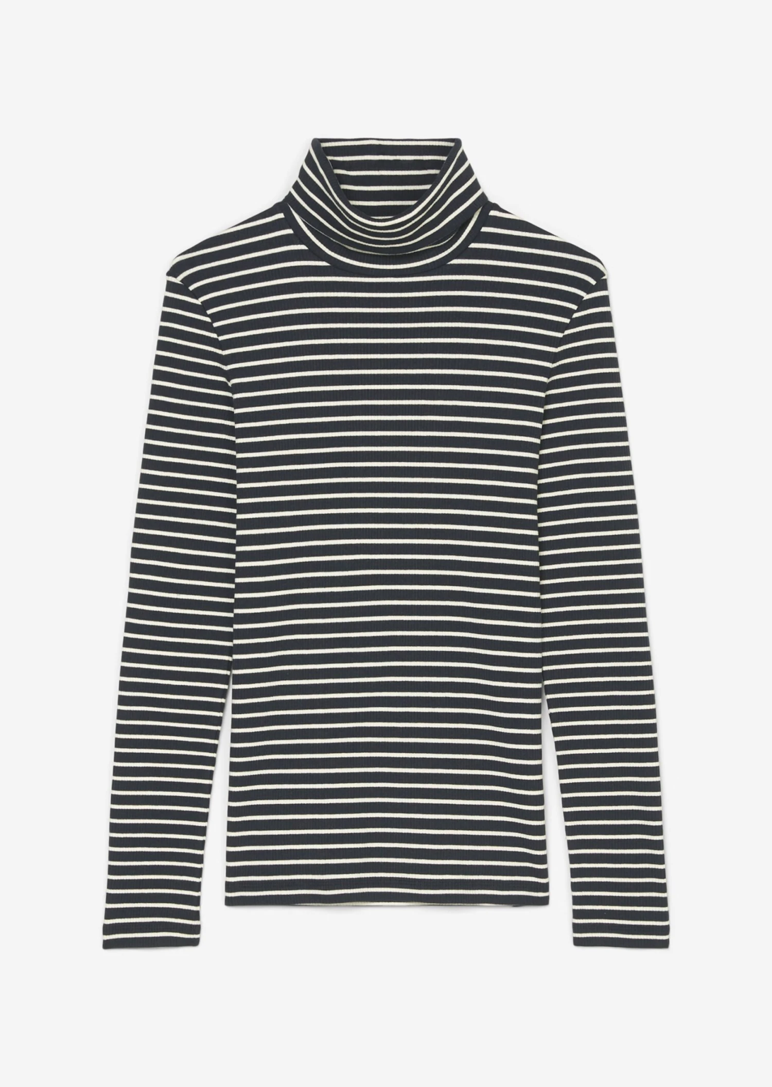 Perfect as an under layer, confident as a solo piece: the striped turtleneck longsleeve with additional fine rib structure. Model made from high-quality, elastic jersey quality in a modal-cotton mix. The feel: super soft – pleasant to wear on the skin. Feminine shaped fit with soft, comfortable turn-up collar, long, narrow sleeves and straight hem line.